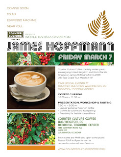 This past Friday our little local was touched by a horde of coffee greatness. United Kingdom and World Barista Champion, James Hoffmann stopped by. He is on an East Coast Coffee Tour and was in DC for an event over at the DC Counter Culture Training Center that night. He came by with Anette Moldvaer, a World Cup Tasting Champion, Cindy Chang, a super-sweetie from Counter Culture Coffee, Trish Skeie, ex-Director of Coffee at Zoka Coffee Roasters, Nick Cho, the owner of Murky Coffee, David Fritzler, Coffee and Beverage Operation Director at Tryst and Open City, Greg Scace, the inventor of the Scace device which measures the actual temperature of the brew head on espresso machines, Katie Duris from Murky Coffee, Ryan Jensen from Counter Culture Coffee and Aaron Ultimo from Murky Coffee. Wheww! That’s a lot of folks.